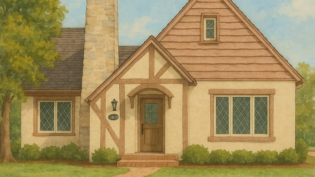 Watercolor of a Tudor-style fixer-upper featured in our blog on using VA loans strategically for real estate investment and home renovation planning.